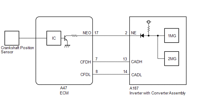 The motor generator control ECU (MG ECU) (built into the inverter with converter assembly) compares the engine speed value calculated based on the crankshaft position signal input from the ECM versus the engine speed value received from the ECM via CAN communication, and when it has frequently judged that the engine speed is high and the deviation between the engine speed values is large, it will store DTC P033506 or P033562.