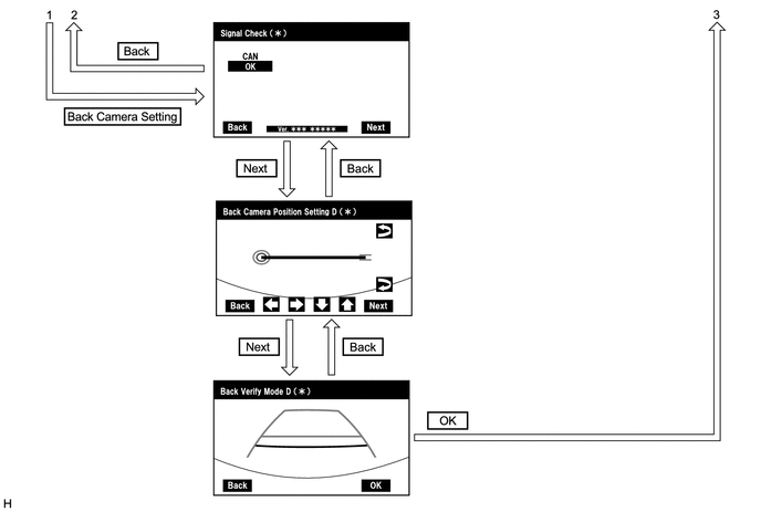 (3) When the screen changes to the "Mode Setting (*)" screen, select "Back Camera Setting" to display the "Signal Check (*)" screen.