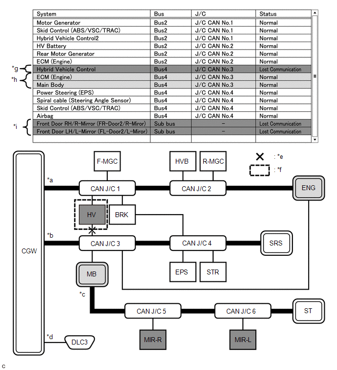 Some ECUs or sensors are displayed as not communicating in the central bus and other ECUs or sensors are displayed as not communicating in a sub bus. |