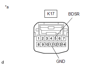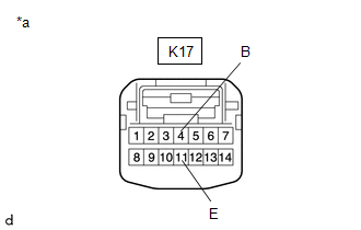 (2) Connect a cable from the positive (+) auxiliary battery terminal to K17-2 (+) and negative (-) auxiliary battery terminal to K17-3 (-), then check that the mirror becomes warm.