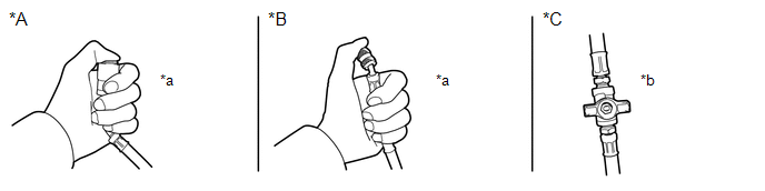 (1) Depending on the type of low pressure side hose of the air conditioner service tool set, prevent air from being drawn in as shown in the illustration.