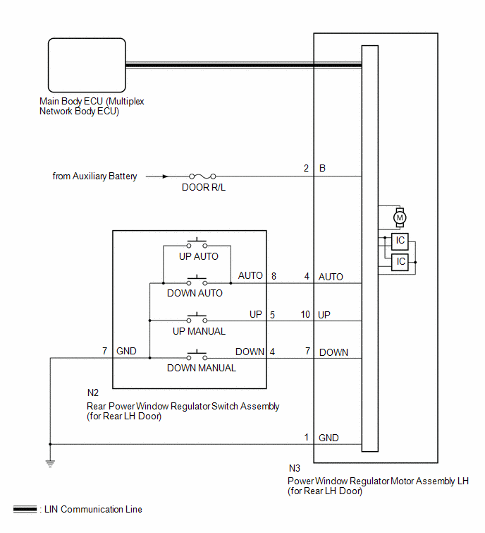 The main body ECU (multiplex network body ECU) communicates with the power window regulator motor assembly (for rear LH door) via LIN communication.